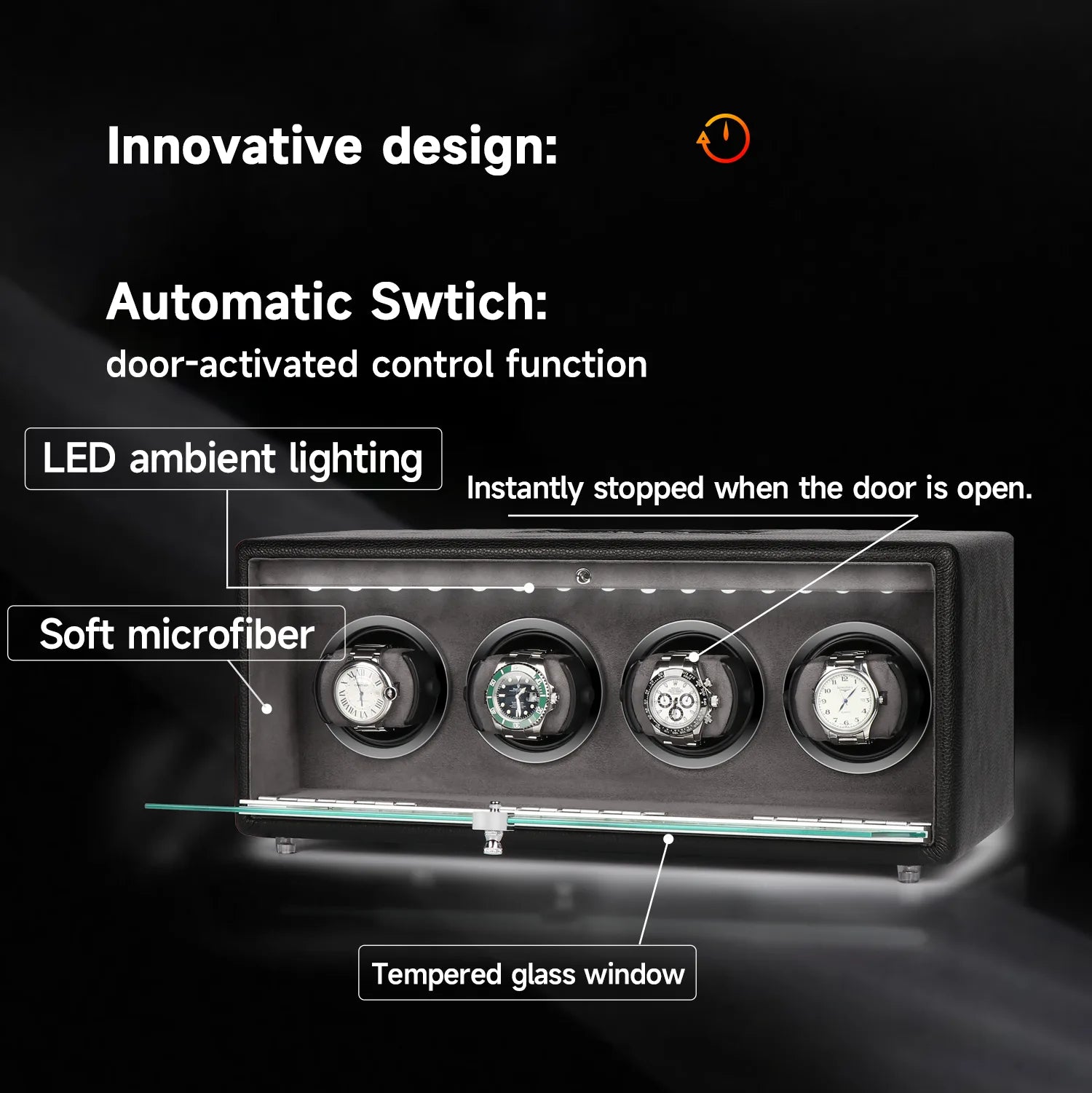 The 4-watch winder features a versatile 9-mode winding mechanism that can accommodate various luxury watch sizes. Its quiet motors allow for discreet placement in any room without disrupting your sleep. The elegant wood construction with a microfiber leather cover adds a touch of class to your watch collection, while the protective microfiber interior safeguards your timepieces. This watch winder embodies a reliable and classic business style, perfect for any automatic watch enthusiast.