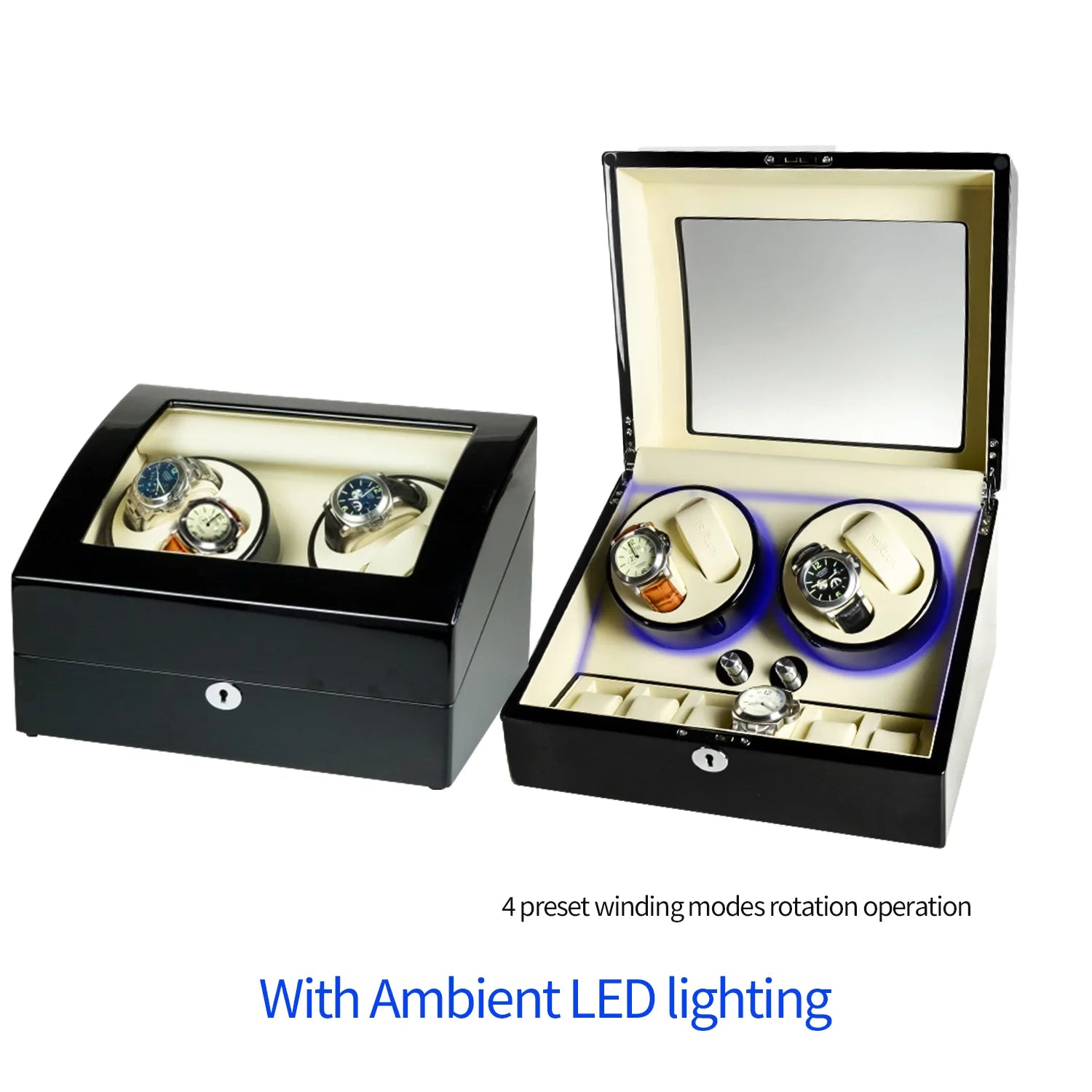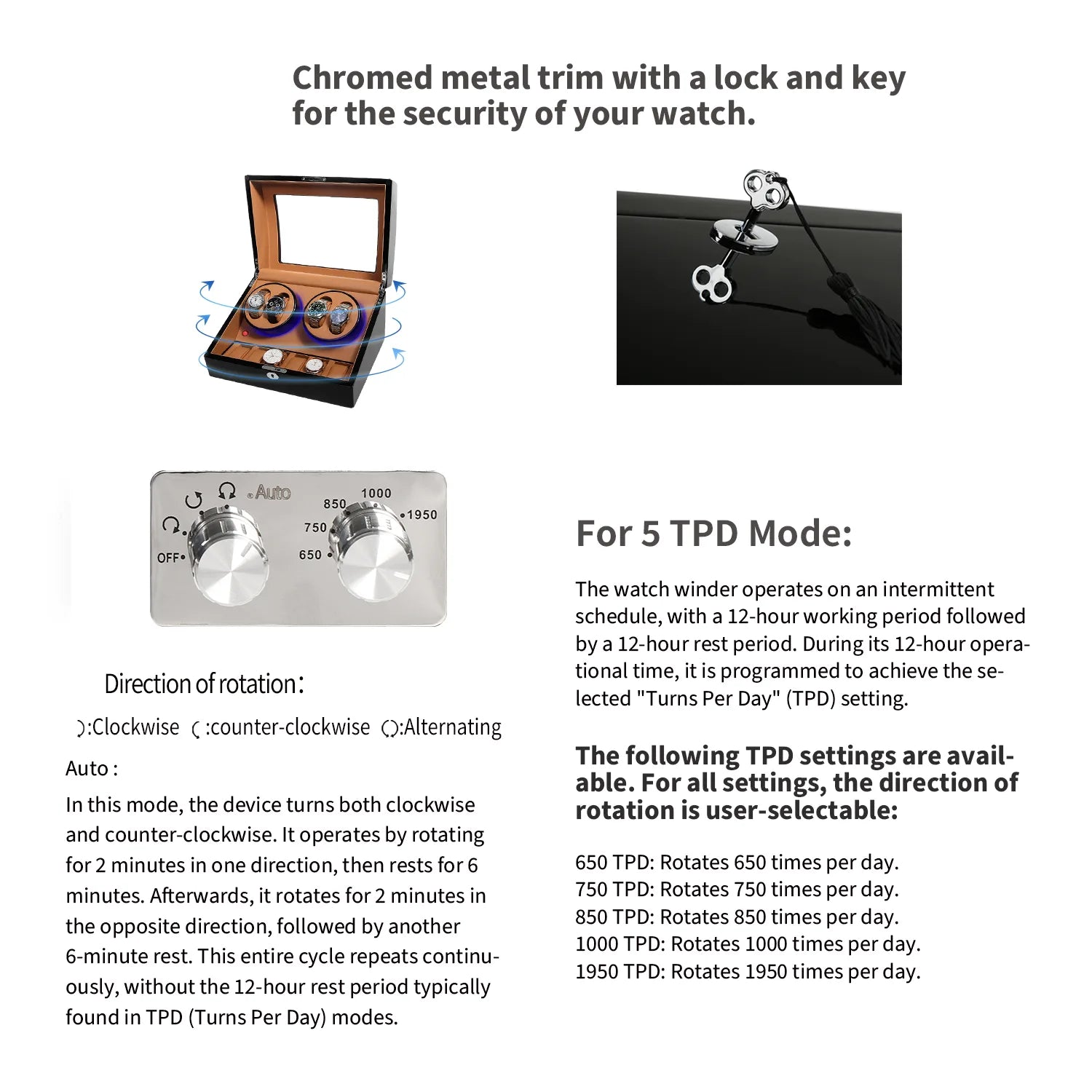 The premium 4-watch winder with extra storage for 6 watches features a versatile preset winding mechanism, that can accommodate various luxury watch sizes up to 60mm/2.36 inches (including the crown). The black high-gloss finish lacquer adds a touch of class to your watch collection while safeguarding your timepieces. This roduct offers different watch winding functionalities. Models featuring black and beige decor are equipped with four preset winding modes. In the brown decor variant provides five distinct TPD (Turns Per Day) mode settings 650, 750, 850, 1000, and 1950 designed to accommodate various watch brands, such as Rolex.